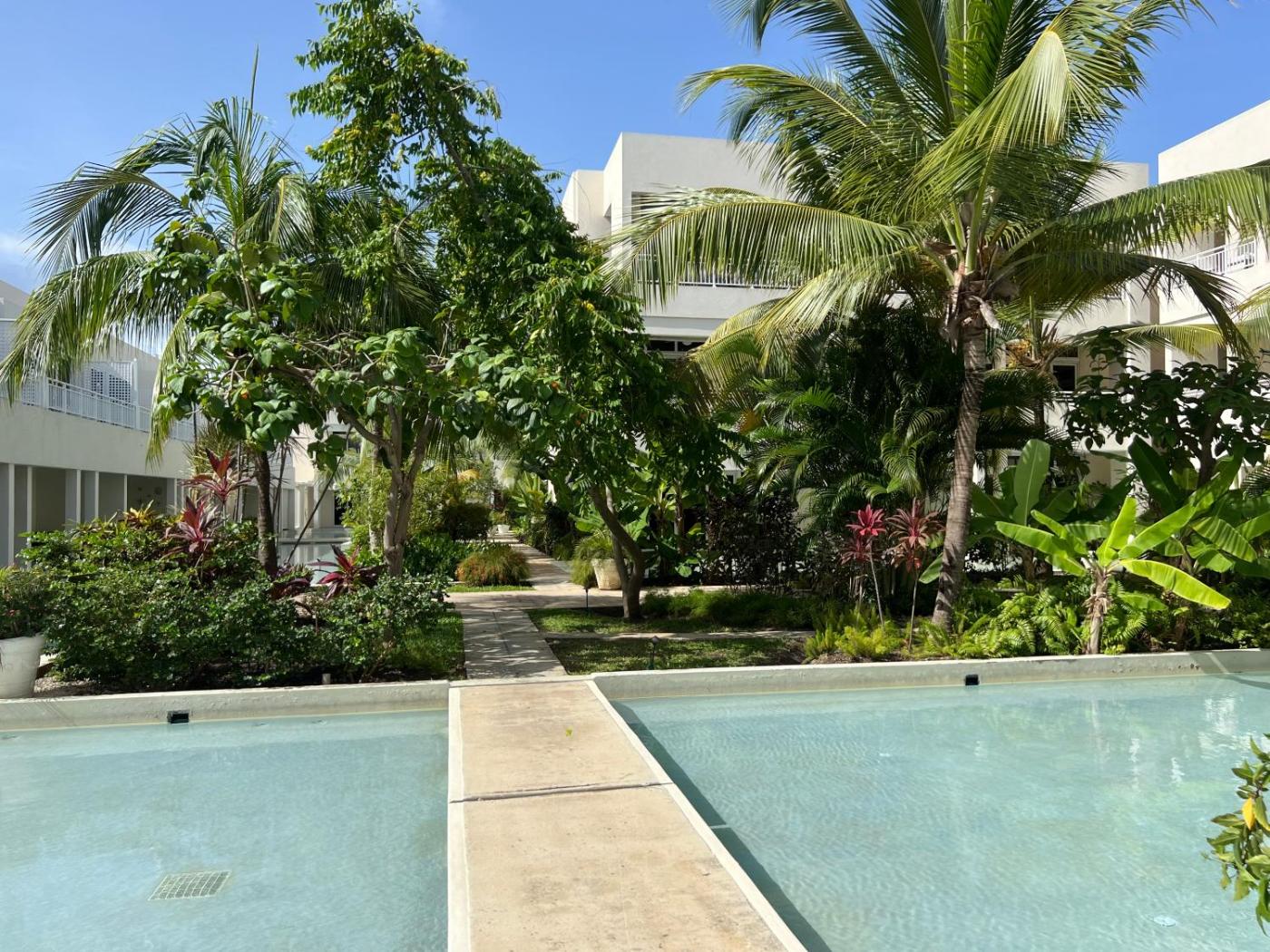 The apartment has a year-round outdoor pool and a terrace.